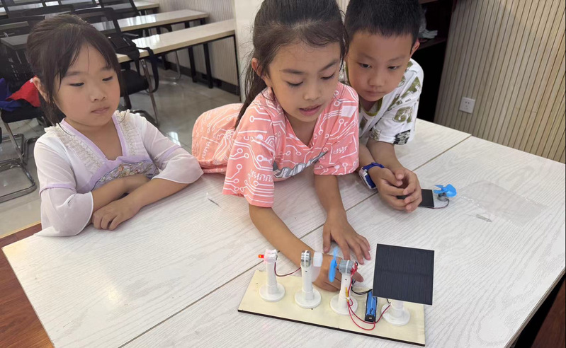 随后,老师们带领小朋友们动手做起了小实验,DIY 太阳能小风扇以及太阳能光敏感应小路灯。在制作太阳能小风扇时,小朋友们小心翼翼地将太阳能板、电机、扇叶等部件组装在一起。当看到自己亲手制作的小风扇在阳光下缓缓转动起来时,孩子们脸上洋溢出了自豪与喜悦的笑容。