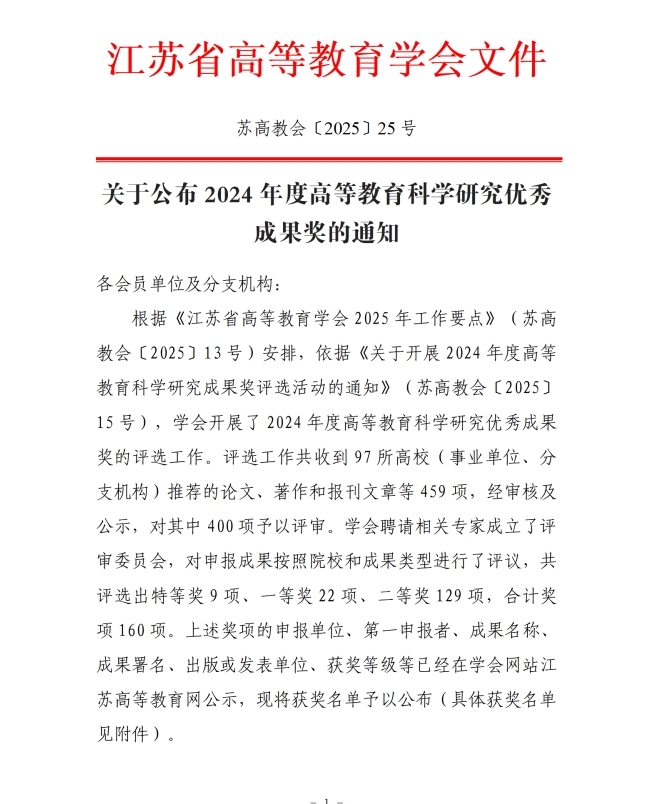 根据《关于公布2024年度高等教育科学研究优秀成果奖的通知》(苏高教会〔2025〕25号),公司张刚博士主持的《基于现代学徒制的校企协同育人机制研究》获得江苏省2024年度高等教育科学研究优秀成果奖二等奖,此次评选由江苏省高等教育学会组织,共收到全省97所高校推荐的论文、著作和报刊文章等459项,最终评选出特等奖9项、一等奖22项、二等奖129项,合计奖项160项。
